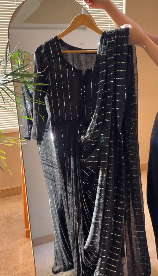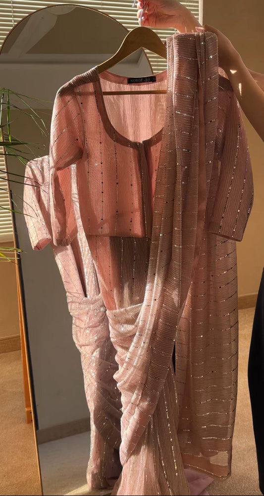 I recently tried the Noroz saree in gorgeous shimmery blue fabric, and I must say it’s an absolute showstopper! The fabric is lightweight yet luxurious, with subtle sparkle and silver sequin stripes that catch the light beautifully. What I love most is how effortlessly elegant it looks — you get the traditional grace of a saree without the hassle of draping.