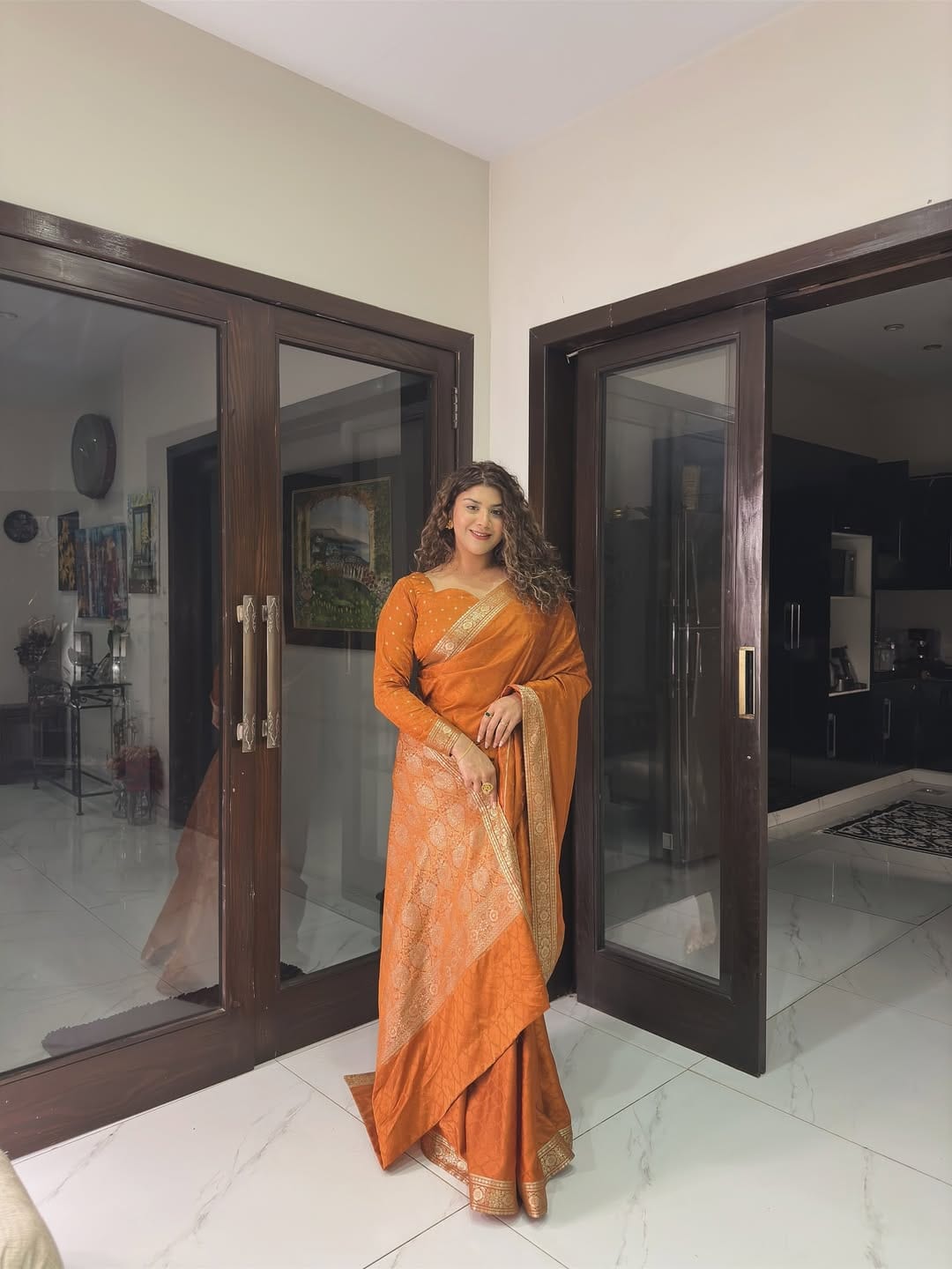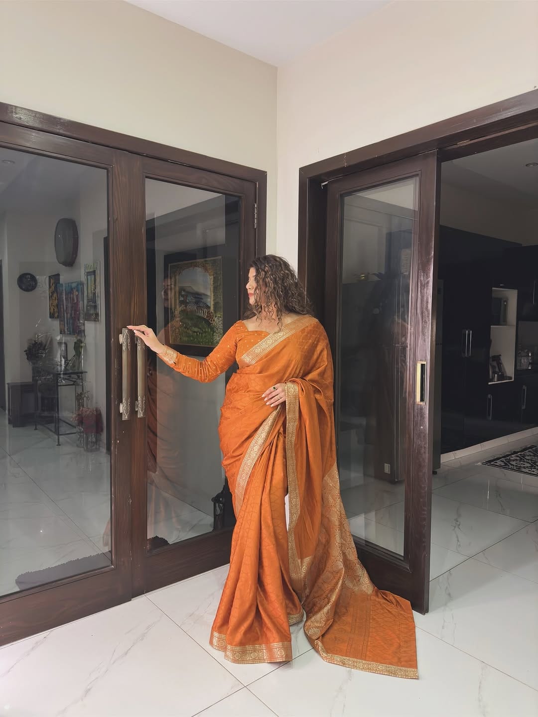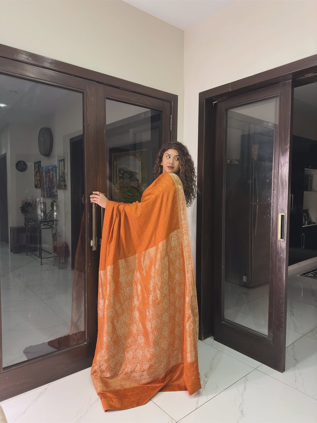 Made with an intricate technique, in which zari is woven this saree is a heritage of its own kind. The essence of the saree is in the lavish pallu, the entire saree is self embossed making it a statement piece. This saree is perfect for nikkah events and surely will be your favourite addition to your wardrobe.
