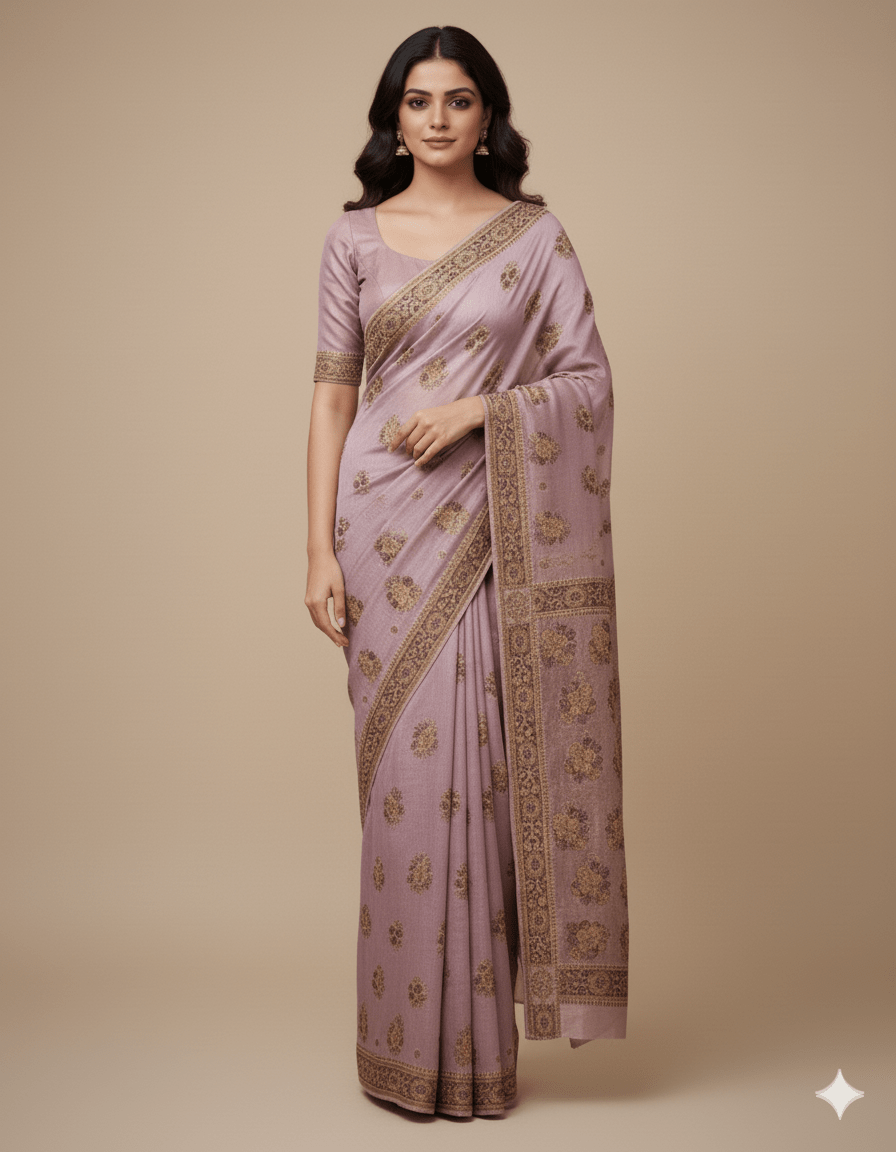 The intricate rose gold and silver zarri work adds a touch of opulence, making every occasion special for all our saree Lovers.