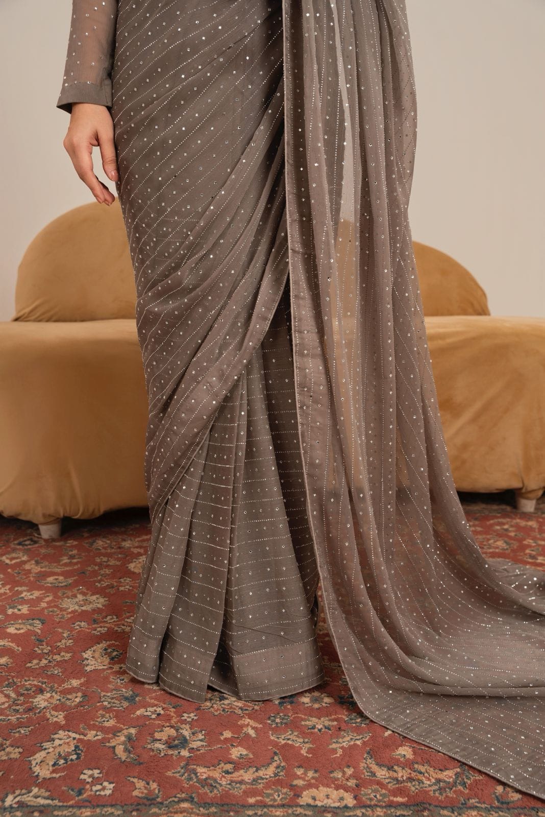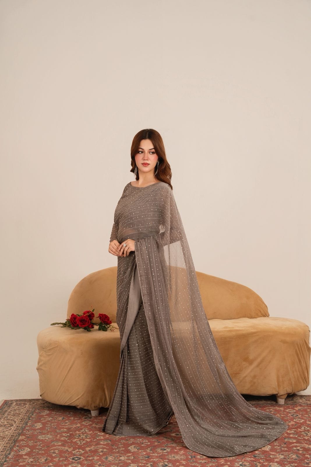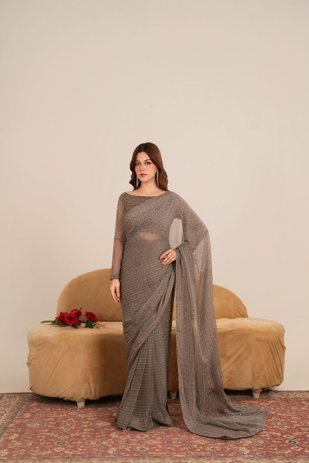 Add a touch of whimsy to your wardrobe with Tara. This chiffon saree loaded with Rhinestone work. The intricate Rhinestone work adds a touch of opulence, making every occasion special for all our saree Lovers. Handmade with possible imperfections, this unique piece will shine with its one-of-a-kind rhinestones. Bring some sparkle and personality to any outfit.
