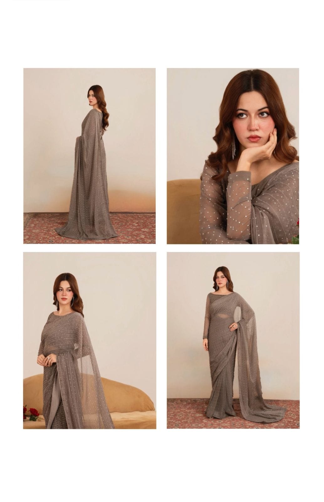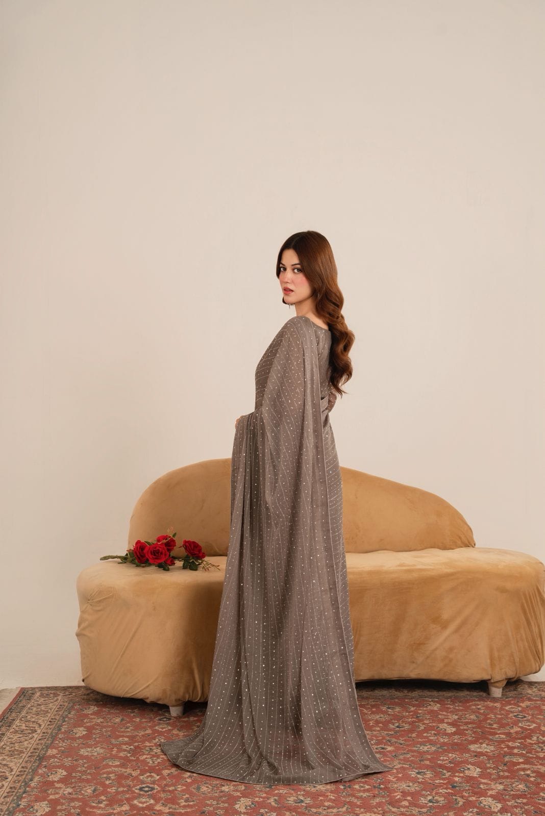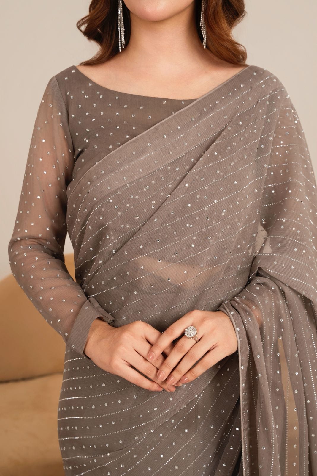 Add a touch of whimsy to your wardrobe with Tara. This chiffon saree loaded with Rhinestone work. The intricate Rhinestone work adds a touch of opulence, making every occasion special for all our saree Lovers. Handmade with possible imperfections, this unique piece will shine with its one-of-a-kind rhinestones. Bring some sparkle and personality to any outfit.